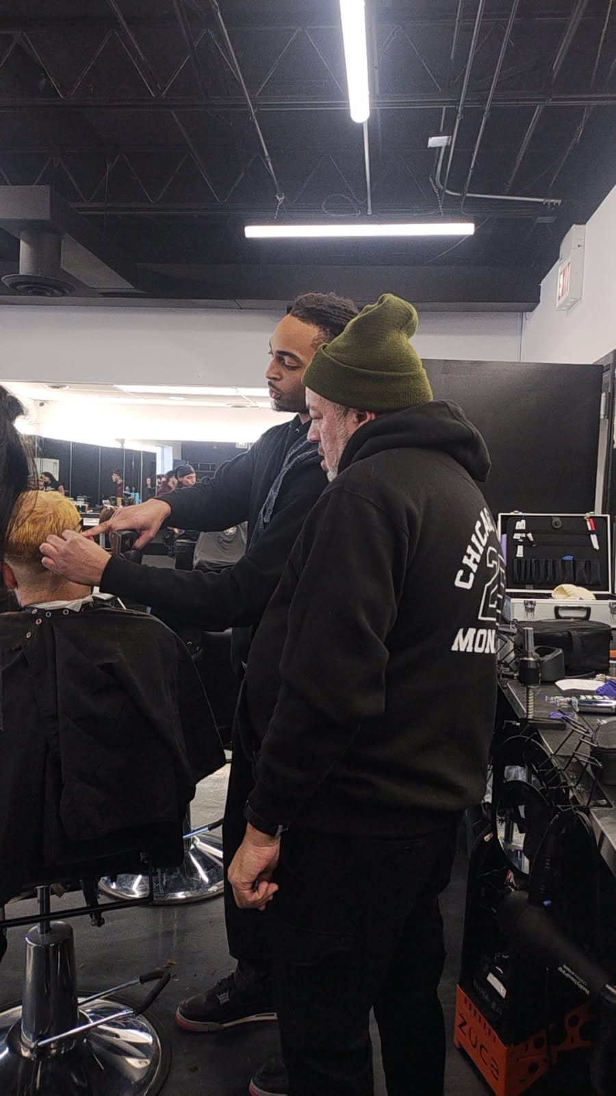 This client presented a few challenges I'd not had to work with before. He had some facial art that was fresh, and clearly put in to draw attention away from some scarring. He had colored, processed hair that was very fine and a variety of color tones in his hair, which... being color-blind... was messing with me at first. I was extremely fortunate that with multiple student teachers now in the barbering program, I had one-on-one coaching throughout the 3ish hour consultation with this client. Dude was very patient as I measured twice (or maybe sometimes 5x) to cut once, as my grandmother used to say (she was a tailor who worked her way out of pogroms, putsches, purges and revolutions until she finally was allowed into the States in the 50s). I learned a lot about the utility of the mirror, showing me how well (or not) a fade is blending in ways I can't see with my own eyes directly on the client.